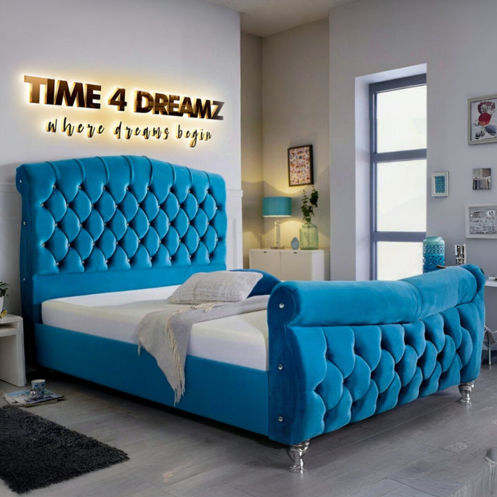 The Valentino Main Double Bed boasts graceful contours and plush velvet upholstery, making it the perfect centerpiece for any modern bedroom.